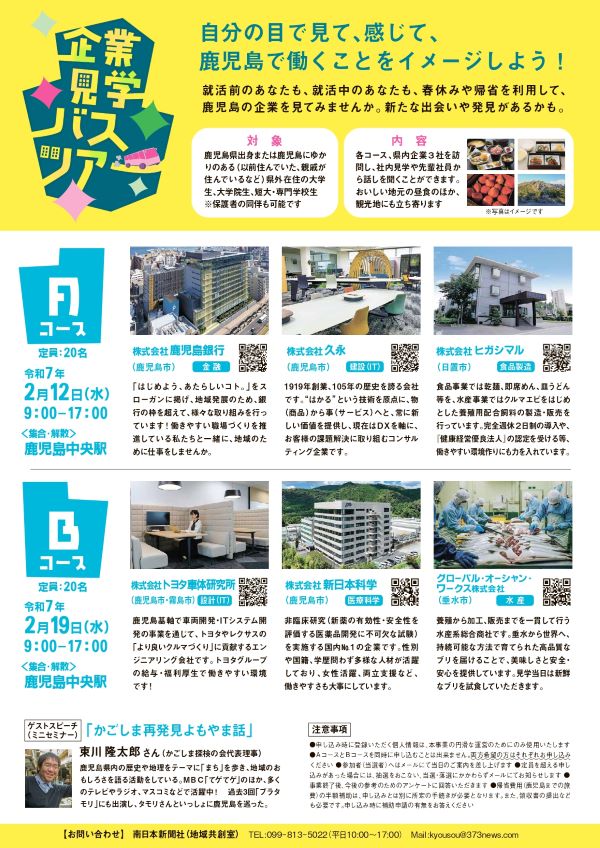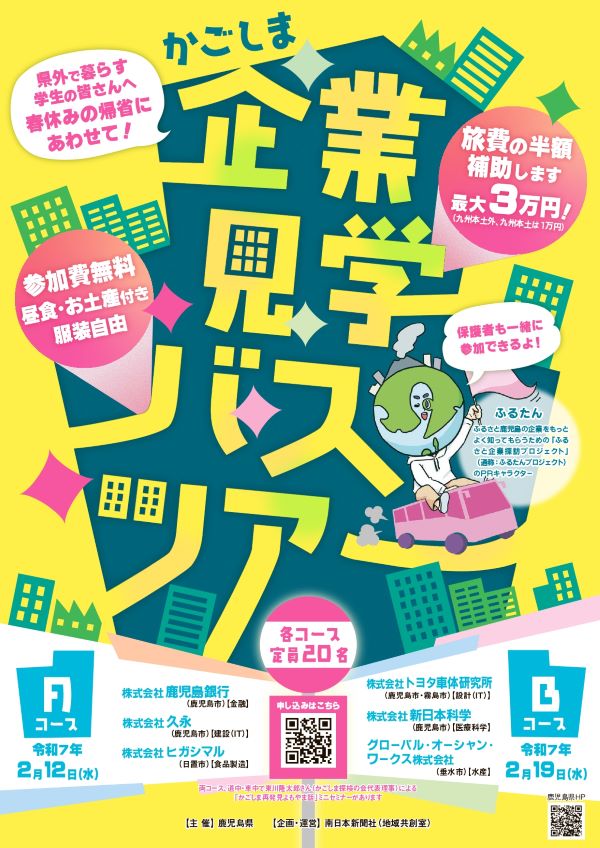 そこで鹿児島県では、県外に進学した学生を対象に、鹿児島の魅力ある企業をめぐりバスツアーを2月に開催します!