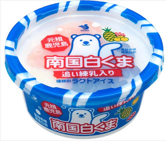 練乳をかけたかき氷にフルーツがいっぱい入った、鹿児島県民にとってはなつかしい味の「氷白熊」。諸説ありますが、氷白熊が出来たのは、昭和7年頃。鹿児島市の西田本通りにあった綿屋さんが、夏の副業としてかき氷屋を営んでおり、そこの新メニューとして登場したそうです。氷白熊の名前は、かき氷にかけた練乳の缶に白熊印のレッテルが貼ってあったのをそのままもらったのだそうです。この氷白熊は大変評判になり、天文館の食堂やデパートの食堂など、鹿児島市内中に広まりました。セイカ食品では昭和44年頃から工場生産を始め、様々な種類・価格で挑戦してきました。発売以来、今ではセイカ食品を代表する商品へと育っています。