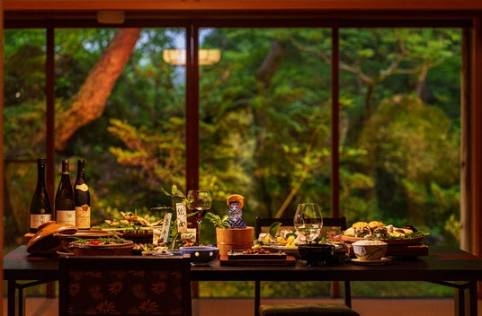 プライベートな空間でゆっくりと味わう「お部屋食」、または色葉に染まる雲仙岳の山々を眺めながらお楽しみいただける「レストラン食」から選択可能です。