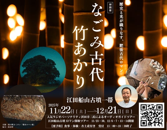 株式会社菊水ロマン館(道の駅きくすい/熊本県和水町)では、熊本県和水町協力のもと、国指定史跡「江田船山古墳公園」一帯を舞台にした夜の体験型イベント『なごみ古代、竹あかり』(入場無料)を2025年11月22日(土)~12月21日(日)の1か月間、開催します。
