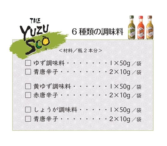 九州生まれの薬味として知られる「ゆずこしょう」。高橋商店でも古くからゆずこしょうを製造していましたが、ある時お客様から「もっとお料理と味がなじみやすい、使い勝手の良いゆずこしょうがほしい」というお声を頂き、開発したのがYUZUSCOの始まりです。ゆずこしょうをお酢で伸ばした「液体ゆずこしょうYUZUSCO」は、液体にすることでどんなお料理にもムラなくなじみ、片手でパパッとかけることができます。原料には「ゆず皮」「酢」「こしょう(唐辛子)」「食塩」のみを使い、無着色・無添加のシンプルな調味料です。味噌汁やうどん、鍋などの和食はもちろん、ピザやカルパッチョなどの洋食との相性も抜群です。