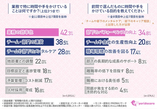 管理職の4割以上が業務効率化に注力している一方、チーム運営や部下のメンタルケアにも多くの時間を割いていることが明らかになりました。
