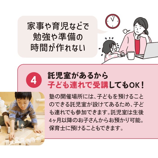 当塾は、スタイルクリエイト株式会社が運営する、託児付きコワーキングスペース&サテライトオフィス(福岡県福岡市大名1丁目3-32 ラ・コルテ203)にて開催され、子ども連れでもプロ保育士にお子さまを預けながら、安心して受講することが可能です。
