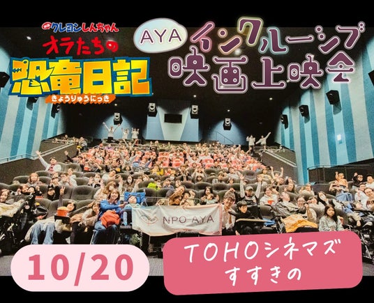 NPO法人AYA(本社:東京都中央区、代表:中川悠樹)は、医療的ケア児・障がい児とそのご家族を対象に、『映画クレヨンしんちゃん オラたちの恐竜日記』を上映するイベント~AYAインクルーシブ映画上映会~を開催。8月18日のTOHOシネマズ ららぽーと福岡(福岡県福岡市)を皮切りとして、全国112都府県で12回の上映会を実施し、延べ1,951名を動員しました。イベントには、同法人代表で医師の中川ほか、医療従事者がスタッフとして参加し映画鑑賞をサポート。参加者からは「家族みんな安心して映画鑑賞ができた」「飛んだり跳ねたり笑ったり、みんなで楽しめた」などの声が届いています。