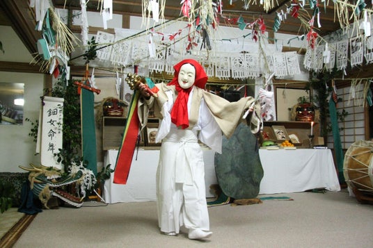 神話の中で、天照大御神が天岩戸に隠れた際、八百万の神々が天照大御神の再出現を願い、天岩戸の前で神楽を舞いました。この話が元になり、宮崎県高千穂地方では、氏神様を民家や公民館(神楽宿)にお招きし、三十三番から成る神楽を、一晩中かけて奉納する神事が行われています。夜に行われることから「夜神楽」と呼ばれ、国の重要無形民俗文化財にも指定されています。