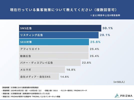 https://www.prizma-link.com/press)は、EC事業担当者(施策運用や全体管理を行っている方)501名を対象に、「EC事業における集客施策の実態調査」を行いました。