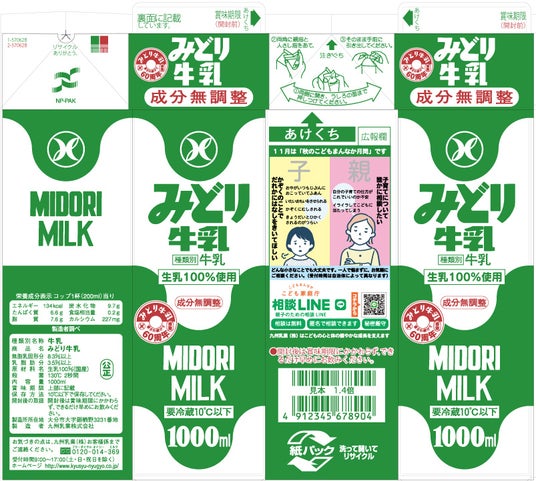 “健康を作るみどり牛乳”を理念とする九州乳業は、この取り組みに賛同し、弊社の主力商品である“牛乳”を通してこどもたちの健やかな成長を支えながら、こどもを生み育てることに喜びを感じられる社会を目指して、今回、幅広い世代に普及しているコミュニケーションアプリ「LINE(ライン)」による全国共通の相談支援システム “親子のための相談LINE”についての広報を掲載することといたしました。生活のなかで生活者の目に触れる機会の多い牛乳パックの側面に『広報欄』を設け、「子育てや親子関係について悩んだときに、こども・若者、子育て当事者を始めとする様々な方々が相談できる窓口」の存在を広く社会に知っていただく取り組みを企業の社会貢献活動の一環として行います。尚、この取り組みは、2020年よりスタートし、今年で5年目となります。