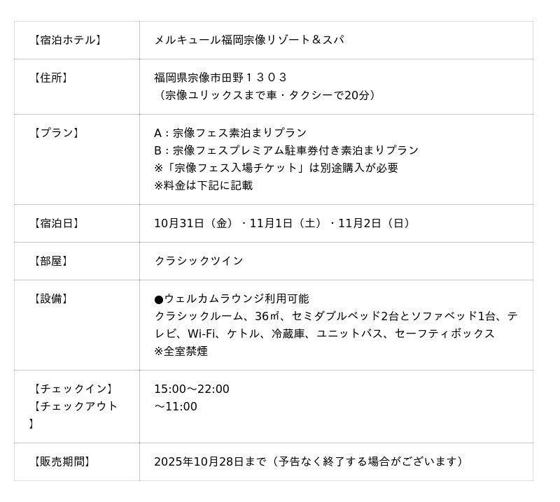 A:宗像フェス素泊まりプラン(入場チケットは含まれておりません)