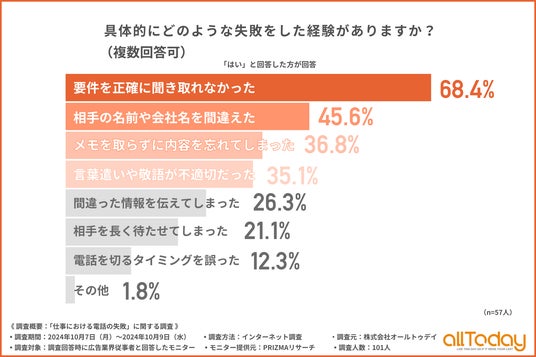 『相手の名前や会社名を間違えた(45.6%)』『メモを取らずに内容を忘れてしまった(36.8%)』『言葉遣いや敬語が不適切だった(35.1%)』となりました。