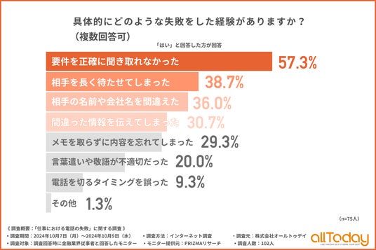 株式会社オールトゥデイ「要件を正確に聞き取れなかった」「相手を長く待たせてしまった」「名前や会社名を間違えた」「間違った情報を伝えてしまった」などの失敗経験が上位に