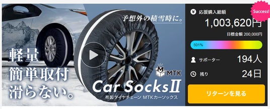 2024年10月31日よりMakuakeにてプロジェクトを開始した、【リニューアル第2弾!】急な大雪時に役に立つ、コンパクト収納の布製タイヤチェーン「MTK カーソックス2」が、大変多くの皆様からご支援をいただき、開始翌日の11月1日には応援金額100万円を突破、目標達成率500%を達成しました!