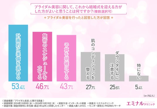 約半数の方が「計画的に準備を進める」と回答しました。他にも「施術のスケジュールを立てる」や「予算を明確にする」という声も寄せられており、ブライダル美容の満足度を高めるには入念な準備が重要なようです。