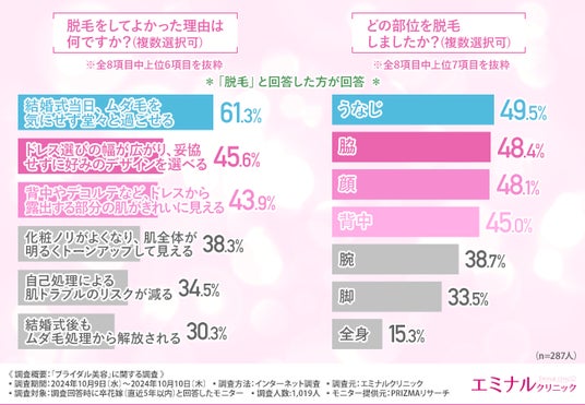 『ドレス選びの幅が広がり、妥協せずに好みのデザインを選べる(45.6%)』『背中やデコルテなど、ドレスから露出する部分の肌がきれいに見える(43.9%)』と続きました。