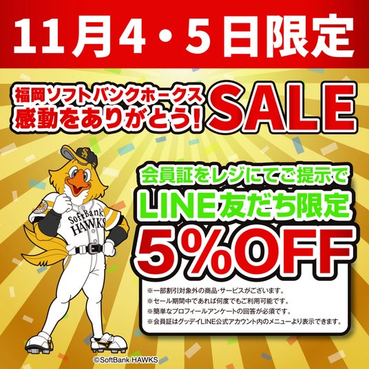 北部九州・山口にてホームセンターグッデイを運営する株式会社グッデイ(本社:福岡市中央区 代表:柳瀬隆志 ) は、『福岡ソフトバンクホークス 感動をありがとう! SALA』 をグッデイ64店舗にて11月4日(月)・5日(火)の2日間限定で開催いたします。