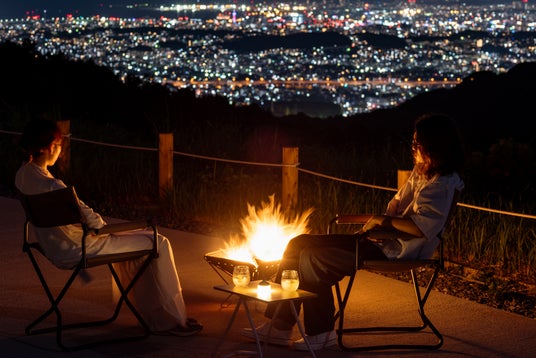 空気の 澄ん だ油山の冬の夜空には 満天の星と美しい夜景が広がります。焚火の温もり を感じながら、
