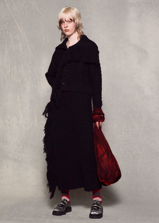 数種類の編地を組み合わせたニットカーディガンと、スカート。折り返した広めの衿、段差のあるアシンメトリーな裾が特徴的なカーディガン。カーディガン・スカート共に、ワイズでパターン化したアラン柄が含まれ、切替部分のフリンジが華やかな印象をつくる。