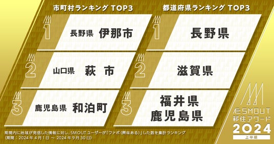 移住・関係人口を促進するプラットフォームサービス「SMOUT」を運営する株式会社カヤック(本社:神奈川県鎌倉市、代表取締役CEO:柳澤大輔、東証グロース3904、以下「カヤック」)は、移住希望者から興味・関心を集めている人気移住地域をランキング化した「SMOUT移住アワード2024上半期」を10月22日(火)に発表しました。