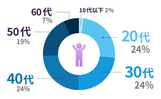 登録ユーザーの年代別の割合は、20代・30代・40代が24%で横並び、50代が19%、60代が7%となっています。コロナ禍をきっかけに30代、40代のユーザー割合が増えています。