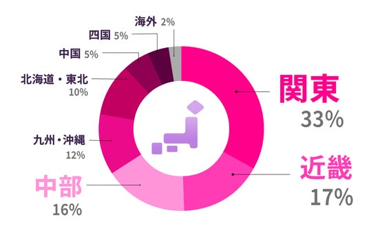 登録ユーザーの地域別(居住地)の割合は、関東在住者が33%と最も多く、次いで近畿地方が17%、中部地方16%。都市部を中心として全国にユーザーを抱える点が特徴です。