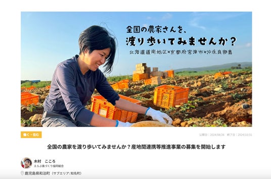 「全国の農家を渡り歩いてみませんか?産地間連携等推進事業の募集を開始します」(興味ある数:200人)。鹿児島県沖永良部島(和泊町・知名町)、北海道八雲町、京都府宮津市という気候や環境の異なる3地域が連携して、各地の農繁期に合わせて働き手を行き来させる事業です。各地域で1週間以上作業に従事するなどの参加条件を満たした参加者には、現地までの交通費上限10万円+滞在先の宿泊費上限10万円、最大で20万円までの交通費・宿泊費が補助されます。(諸条件あり)。農業といえばひとつの地域に根ざすイメージがありますが、旅するように地域を渡り歩きたい人たちを労働力として確保する、新たな一手が登場しました。産地間連携事業は農林水産省による農業労働力確保の支援事業で(※2)今後さらなる広がりが期待できます。