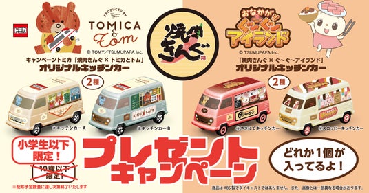 全国で334店舗展開中の『焼肉きんぐ』は、2024年11月1日(金)から数量限定で、『キャンペーントミカ「焼肉きんぐ×トミカとトム」』と『オリジナルキッチンカー「焼肉きんぐ×ぐ~ぐ~アイランド」』をご来店いただいた小学生以下限定でプレゼントいたします。