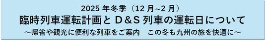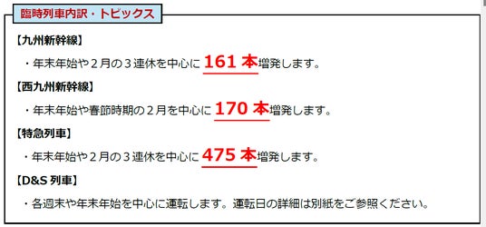 JR 九州では、お客さまのご利用が多く見込まれる冬季期間(12 月~2 月)に臨時列車(新幹線・