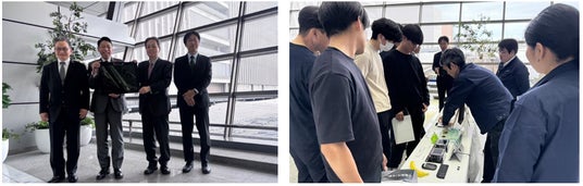 今般の実証実験開始に伴い、同日、博多駅3階改札内コンコースにおいて、ペロブスカイト太陽電池の認知拡大を目的とした体験イベントを実施しました。体験イベントでは、服部 誠太郎 福岡県知事、古宮 洋二JR九州代表取締役社長執行役員、堀内 保 エネコート取締役 最高技術責任者および山口 康春 日揮代表取締役社長執行役員が参加した見学会のほか、鉄道を利用するお客さまが「見て、触れる」ペロブスカイト太陽電池を用いた展示品の展示などを行いました。