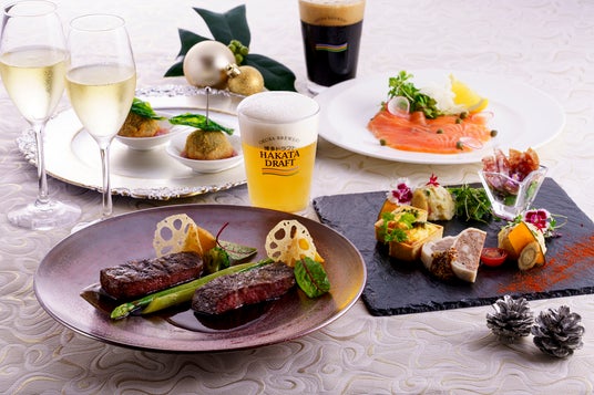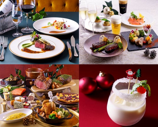 期間限定でご用意する「クリスマスメニュー」は、伝統的なフレンチフルコースディナー、ビールとのペアリングに合わせたカジュアルな料理、多彩な料理を楽しめるディナーブッフェ、さらにはクリスマスを盛り上げるスペシャルドリンクなど、さまざまなシチュエーションに応じてメニューをお選びいただけます。