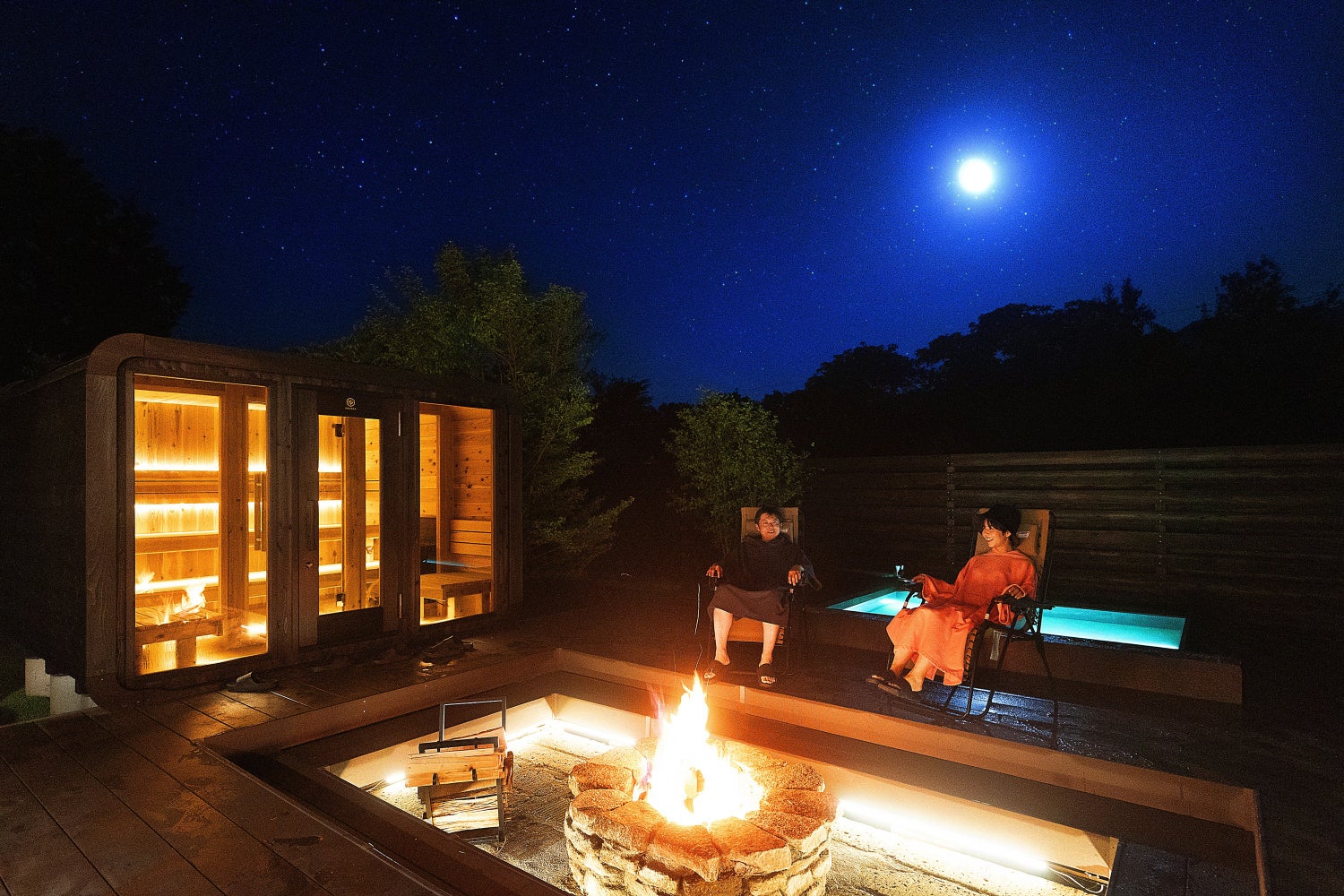 寒冷地用に前室が設けられたアウトドアサウナ「RIISI(リージ)2700」が楽しめる「SAUNEA白州(山梨県北杜市)」。6人まで宿泊可能。大自然の中でサウナやBBQ、たき火を楽しめる。詳細はこちら。