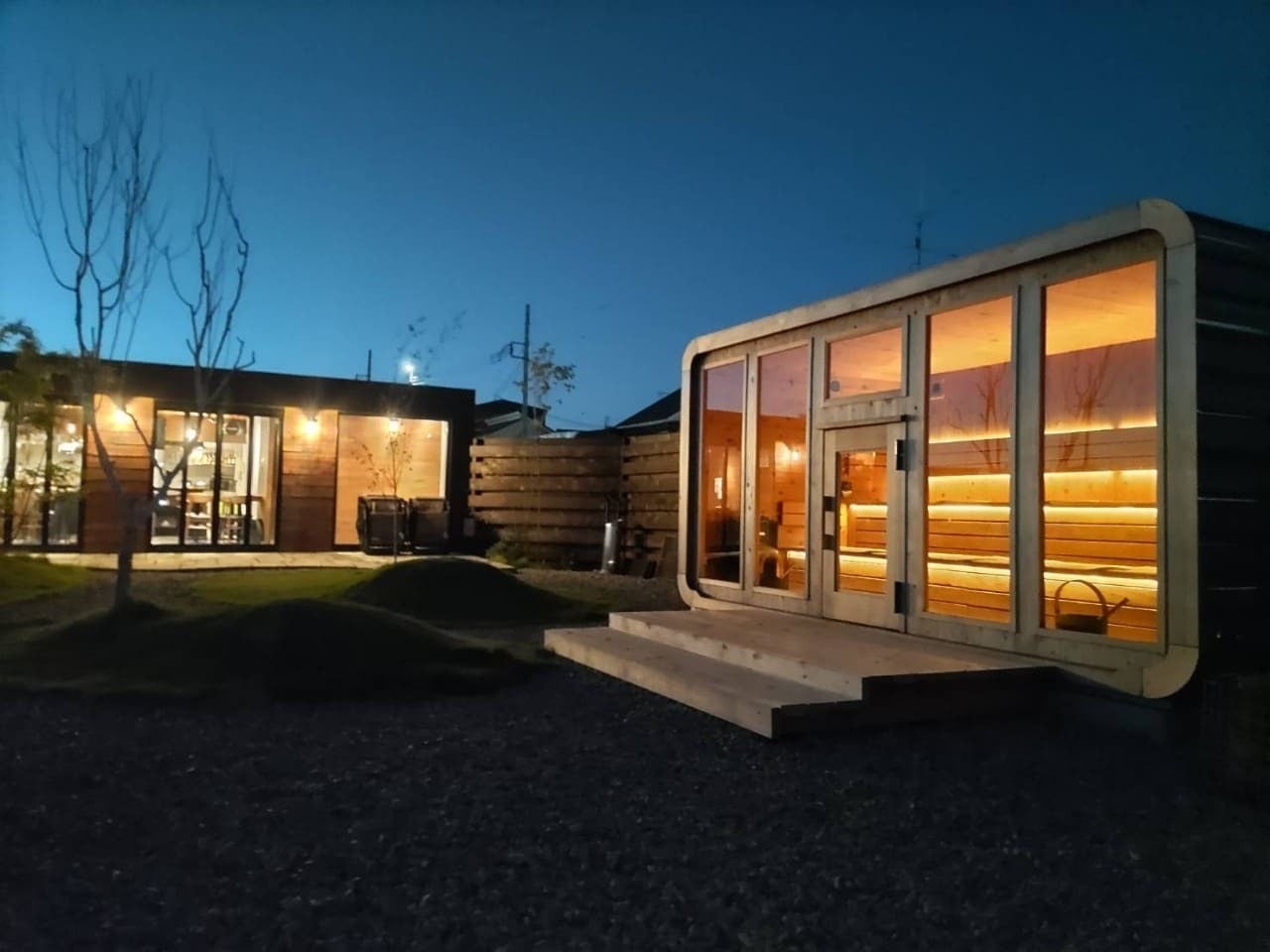 ライトアップされたSAUNEA浦和(埼玉県さいたま市)。10~14人収容可能なアウトドアサウナ「RIISI(リージ)2500ワイド」とチラー(冷却装置)付き大型プールが楽しめる。建物内では業務用キッチンも利用可能。詳細はこちら。