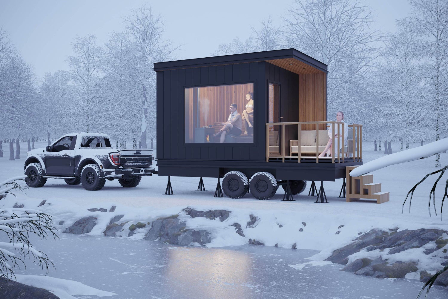 PIONEERI(ピオネーリ)はけん引することでどんな場所でも手軽に本格的アウトドアサウナが楽しめる。(イメージ図)