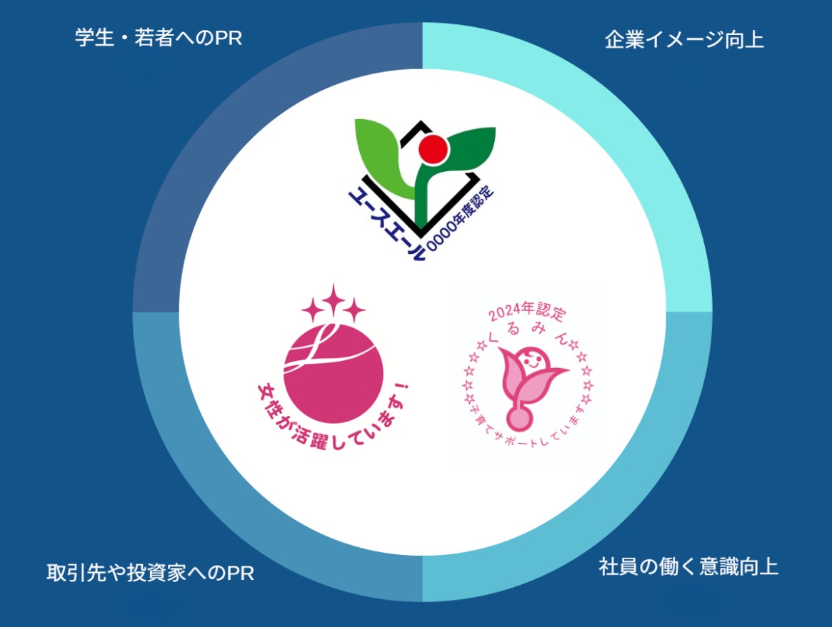 「えるぼし認定(女性活躍)」は、厚生労働省が推奨している認定制度の1つでしかありません。ほかにも「くるみん認定(子育て支援)」や「ユースエール認定(若者の雇用促進)」など様々な認定制度が存在しています。