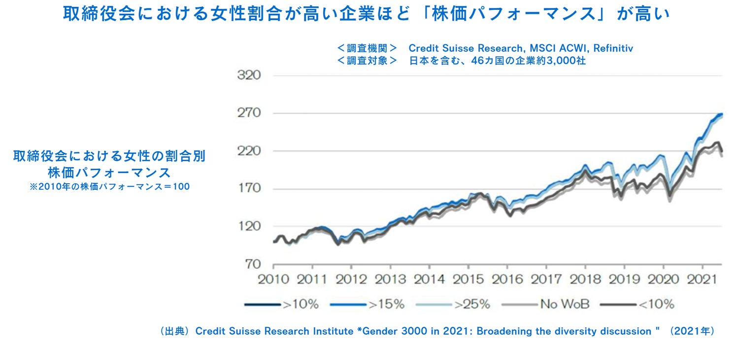 2、世界的な調査機関「Credit Suisse Research」が発表した分析結果で、女性取締役がいる企業の「株価パフォーマンス」が高いというデータを確認