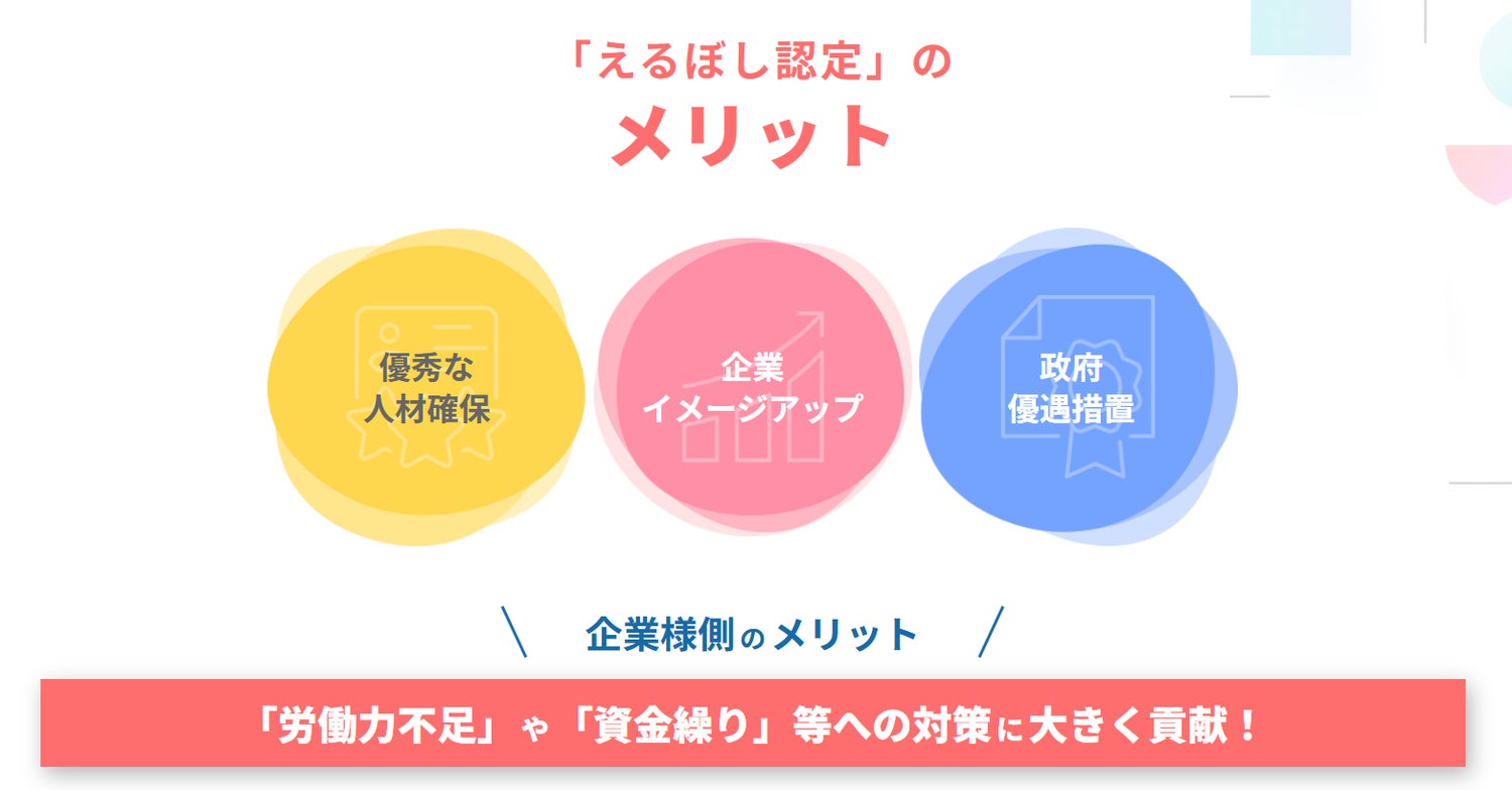 「えるぼし認定」を取得することで、「女性が活躍している企業」という企業ブランディングの観点から採用力強化に繋がりますし、その他にも、日本政策金融公庫から低金利で融資を受けられたり、優遇税制が適用されるだけでなく、補助金審査時の加点措置や公共調達にて加点評価されたり、経営上の様々なメリットがあるのも特徴です。