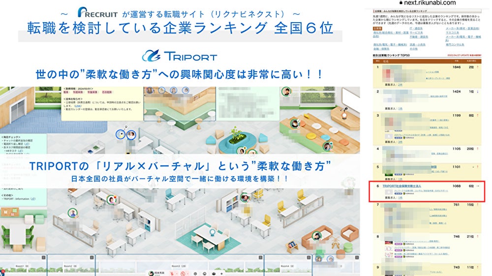 1、リクルート社が運営する「リクナビNEXT」で、TRIPORT自身が「転職を検討している企業ランキング全国6位」にランクイン(集計期間:2022年4月時点)