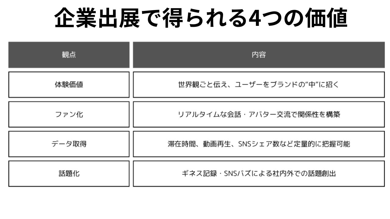 Vketはもともと、クリエイターが3Dデータを個人間で売買する場としてスタートしましたが、近年では企業・団体の参入が急増。イマーシブな体験を通じてブランド認知や好感度を高め、ファン創出を図るマーケティングの新たな場として注目されています。