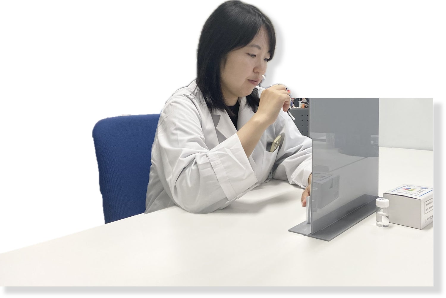 研究員たちは、開発する製品の品質を保つため、国家資格である「臭気判定士」の試験でも用いられる嗅覚検査を定期的に実施し、評価者としての適性も確認しています。訓練だけではなく、臭気判定士の資格を取得する研究員もおり、香りのプロフェッショナルとしての専門性を高めています。