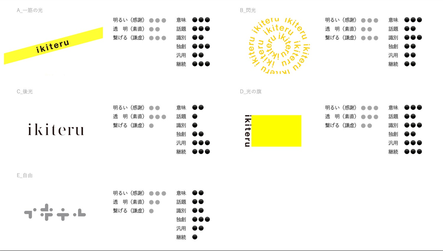 キーワードをもとに、世界観やロゴが作られます。ikiteruのロゴ開発では、5つの案が提案されました。通常、提案される案は2~3つ程度が一般的ですが、今回は社内プロジェクトということもあり、特別に多くの選択肢が用意されました。![]()
