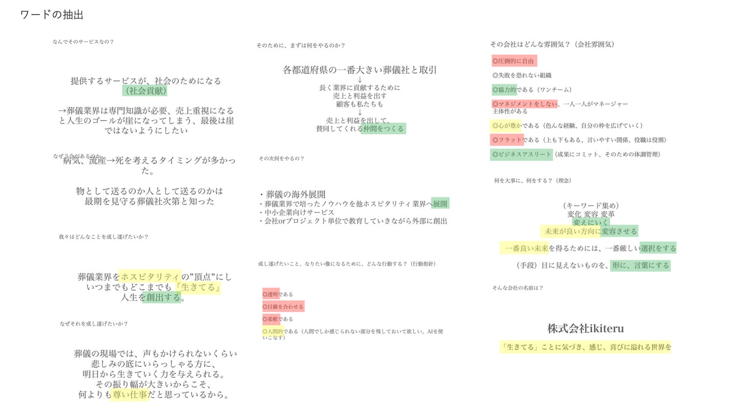 ikiteruのブランド開発では、安岡が過去に他社のブランド開発に携わった経験から、事前に自身の言葉を整理した資料を準備しました。この資料は、ヒアリングの中で重要なキーワードを抽出する際に活用されます。拾われたキーワードは、整理され3つの色に分けられました。これによりブランド開発の方向性が具体的に見えてきます。