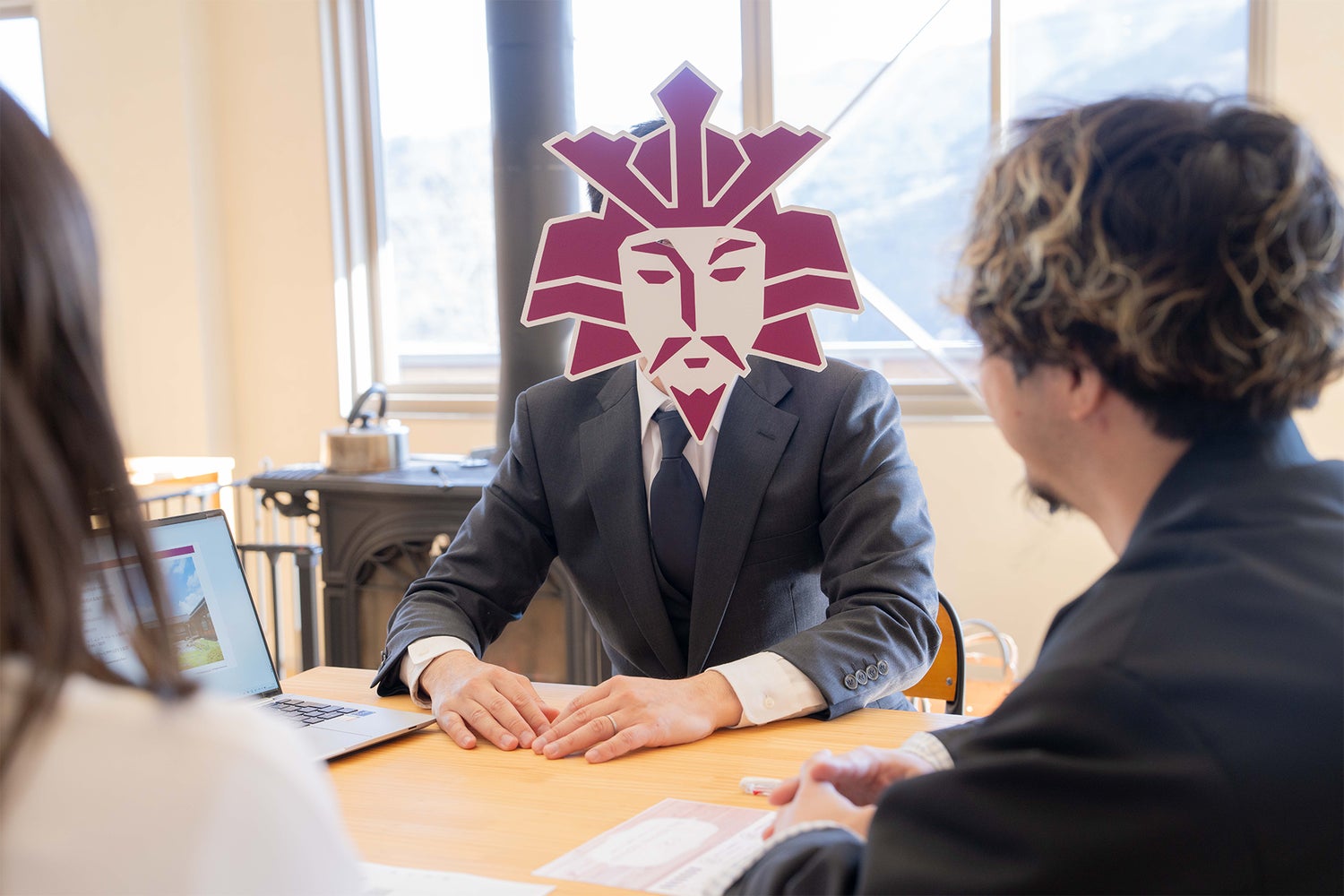 こうして、お面をかぶるということが先に決まり、「次に、会社のロゴをどうしよう?」となったとき、“顔ロゴ”にすればお面をしても何の違和感もないということになり、顔ロゴを採用しました。なお、顔ロゴはよく見るとアシンメトリーになっているのですが、これは野立看板にしたときに運転手のほうを見ていないようにするため(夜、田んぼしかないような道で目が合ったら怖いかもしれないと思ったため)です。