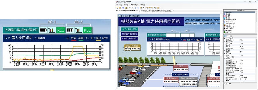 CISASは電力の使用状況をグラフィックモニタで把握できます。グラフィックモニタは俯瞰図になっていて、施設内の状況をひとめでイメージでき確認しやすくなっています。また、電力オーバーしそうな時にはメール通報だけでなくグラフィックモニタと連動し音やランプなどでもお知らせができます。データはトレンドグラフ表示、グラフィック表示としても見ることができます。そのほか日報・月報の出力も可能です。