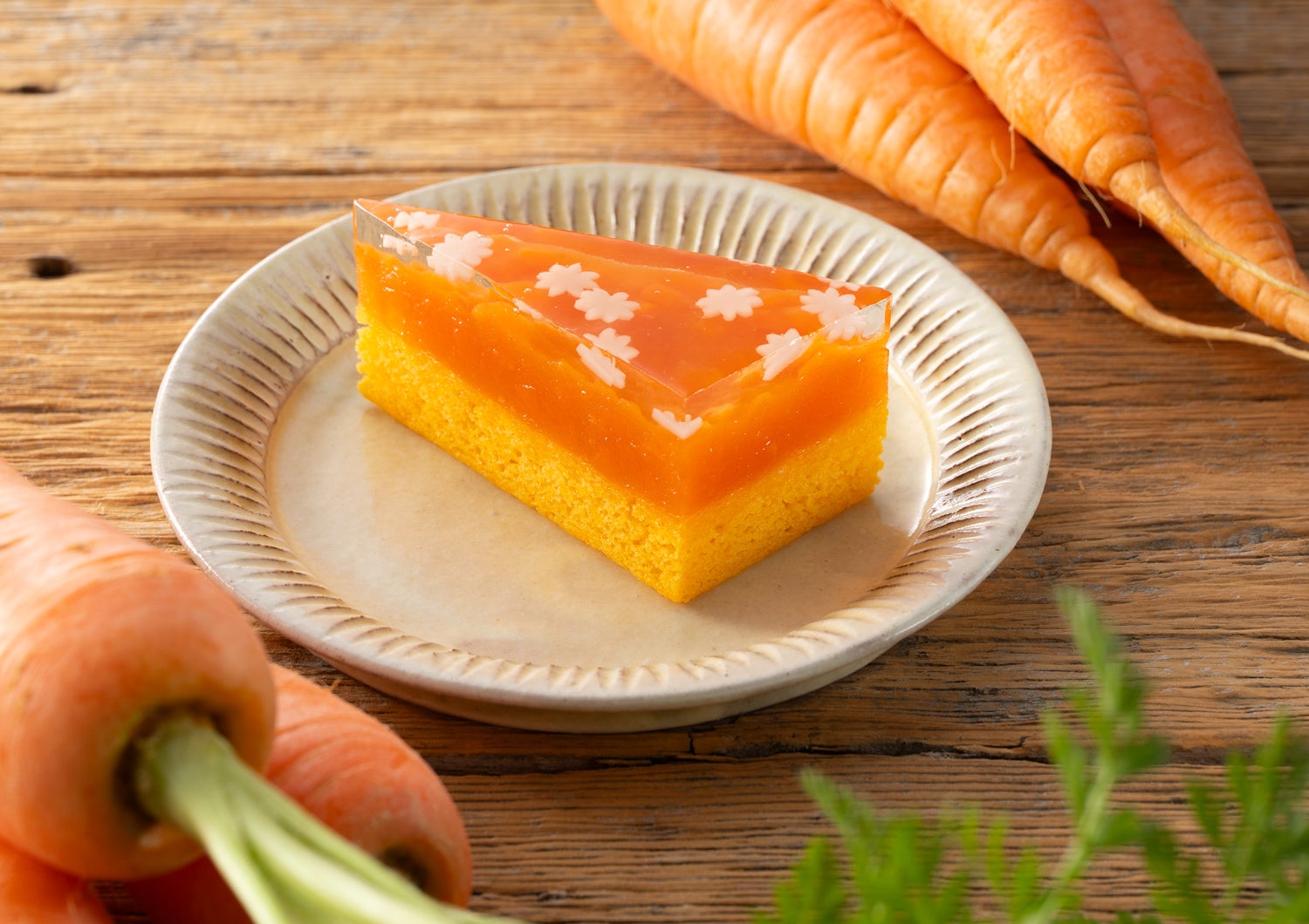 にんじんの優しい甘味、人工着色料を使わず、にんじんのカロテノイド色素で色付いた、しっとりとした浮島、にんじんダイスの食感を活かした羊羹、上面には、にんじんの花をイメージした羊羹を散らした、可憐な和風ケーキに仕上がったと思います。