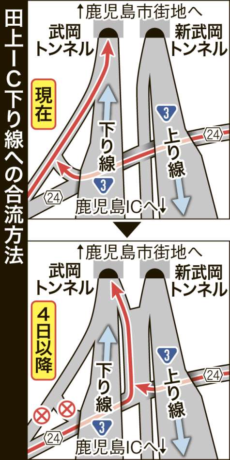 市街地方面に向かう田上IC下り線への入り口は4日午前5時、右側車線側に合流する形に変わる。安全確保のため50cc以下の原動機付き自転車(原付き)は進入禁止となり鹿児島国道事務所は迂回路として県道24号(鹿児島東市来線)を利用するよう呼びかけている。