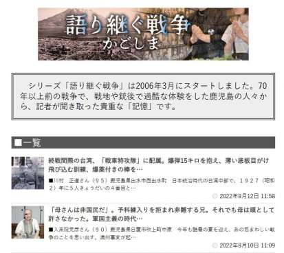 「語り継ぐ戦争 かごしま」 南日本新聞HPに特設ページ 戦争体験者の証言紹介