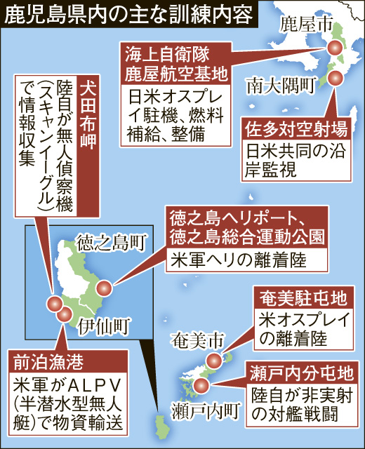 徳之島は県内で唯一、「生地(せいち)」と呼ばれる訓練場以外で訓練する。陸自約50人、海兵隊約50人が参加。米軍のALPV(半潜水型無人艇)を使う物資輸送=伊仙町の前泊漁港=や米軍ヘリの離着陸訓練=徳之島町のヘリポートと総合運動公園=などが予定される。南大隅町の佐多対空射場では日米共同の沿岸監視や電磁波訓練がある。