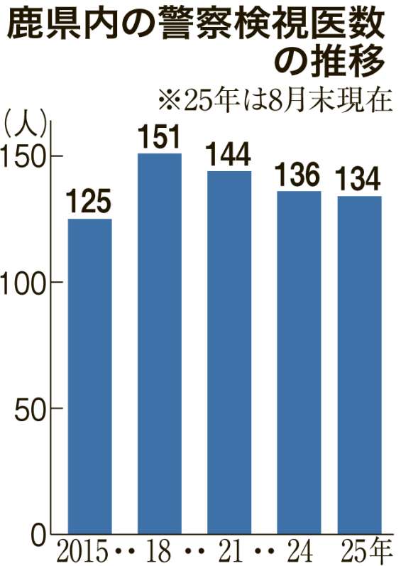 鹿児島県警によると、検視医は3年更新で、主に地域の開業医に委嘱する。2025年8月末時点で、県内には134人おり、平均年齢は62.5歳。18年の151人から減少が続く。県内で一番多い地域は鹿児島市の南警察署管内で11人。一方、出水署、屋久島署管内は1人と地域差がある。