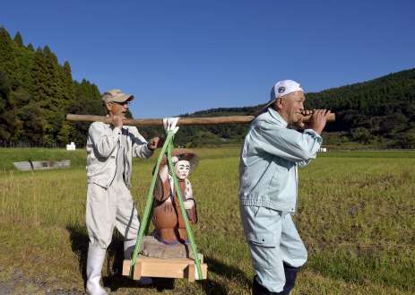 うんとこしょ…えっほえっほ。今年も良かコメができました。田の神さあに伝えなきゃ。田んぼを担いで回らなきゃ さつま・下狩宿集落